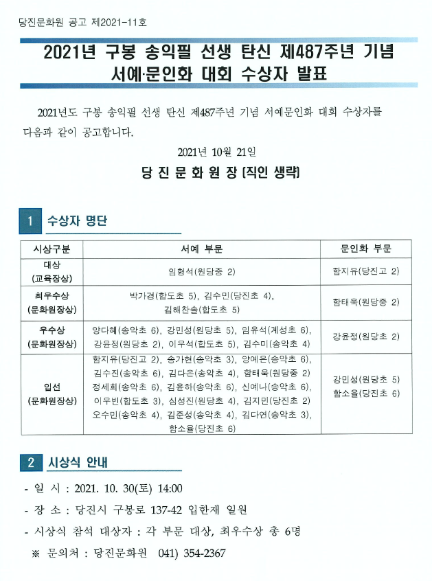| 제목 | 2021년 구봉 송익필 선생 탄신 제487주년 기념 서예‧문인화 대회 수상자 발표 | ||||