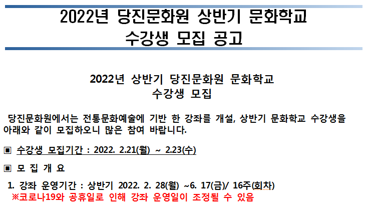 | 제목 | 2022년 상반기 당진문화원 문화학교 수강생 모집 공고 | ||||