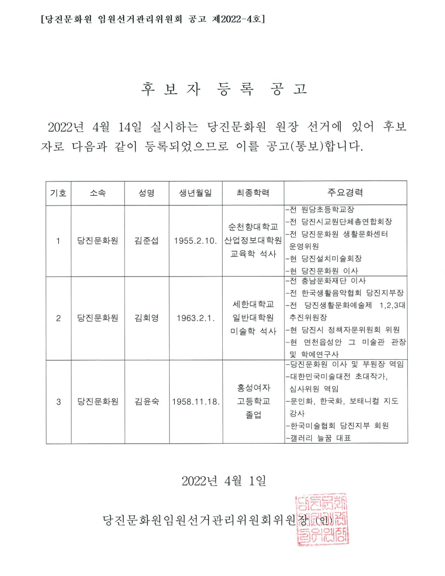 『 2022년 제12대 원장 선거 후보자 등록 공고 』글의 상세내용을 확인하는 표로 제목, 작성자, 등록일, 조회, 첨부, 내용으로 나뉘어 설명합니다.