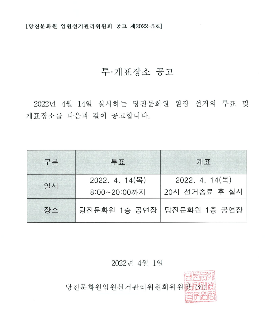 『 2022년 제12대 원장 선거 투·개표장소 공고 』글의 상세내용을 확인하는 표로 제목, 작성자, 등록일, 조회, 첨부, 내용으로 나뉘어 설명합니다.