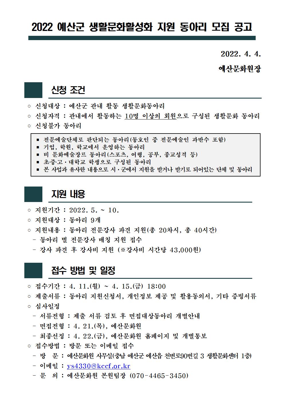 | 제목 | [모집공고] 2022 예산군 생활문화활성화 지원 동아리 모집 공고 | ||||