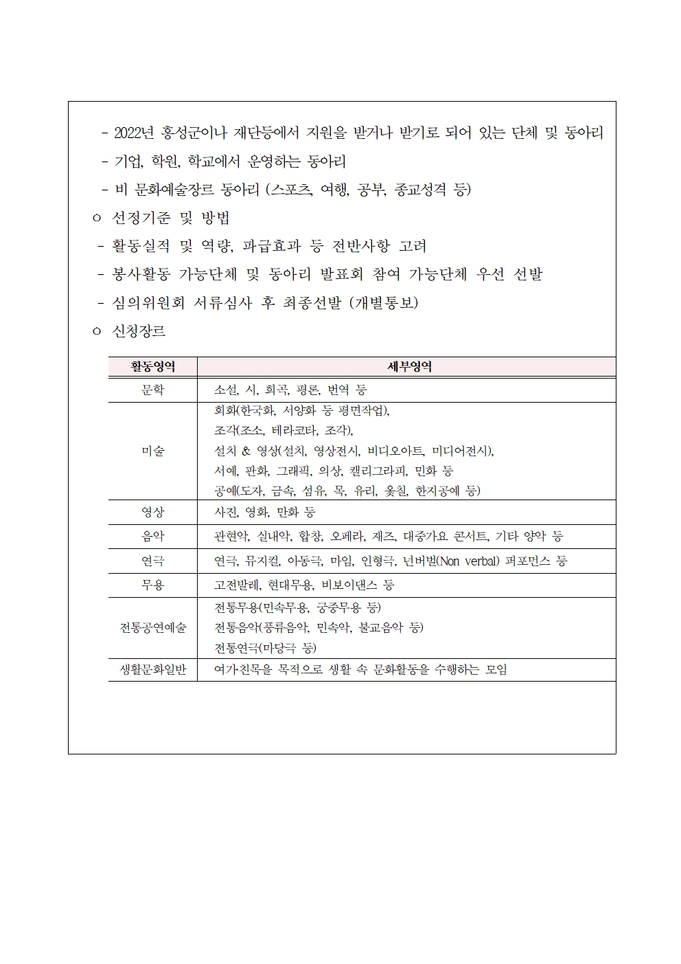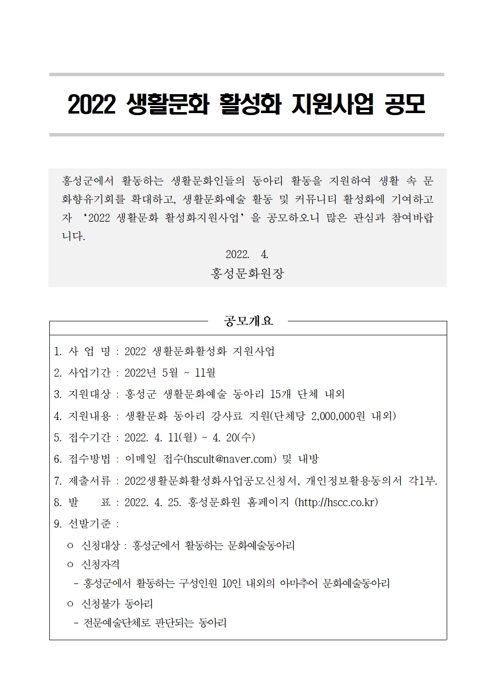 | 제목 | [공고문] 2022 생활문화 활성화 지원사업 공모 안내 | ||||