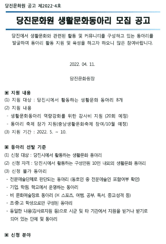 | 제목 | 2022년 당진문화원 생활문화동아리 모집 공고 | ||||