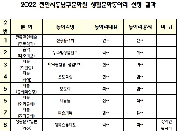 | 제목 | 2022 생활문화 활성화 지원사업 동아리 모집 결과 | ||||