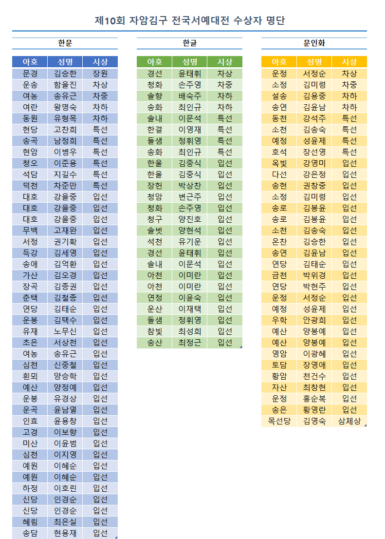 [심사결과] 제10회 자암김구 전국서예대전 심사결과안내 제10회 자암김구 전국서예대전 심사결과를 다음과 같이 공고합니다.