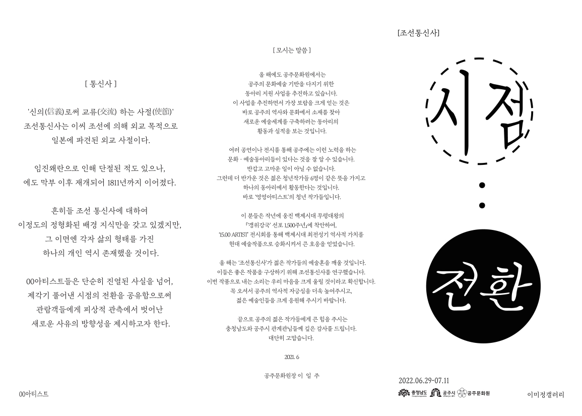 ◈ 전시기간 : 2022.6.29.(수) ~ 7.11.(월) ◈ 전시장소 : 이미정갤러리 ◈ 추최·주관: 공주문화원 ◈ 후 원: 충청남도, 공주시 ※ 공주 시민 여러분의 많은 관심 부탁드립니다. |