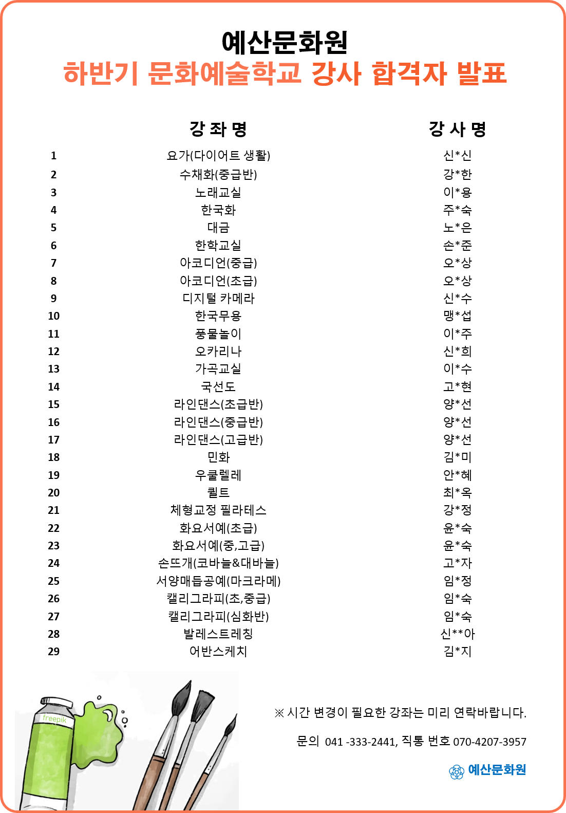 『 [예산문화원] 문화예술학교 강사 합격자 발표 』글의 상세내용을 확인하는 표로 제목, 작성자, 등록일, 조회, 첨부, 내용으로 나뉘어 설명합니다.