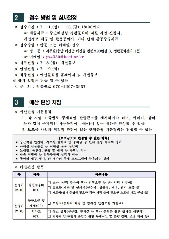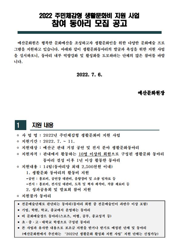 | 제목 | [예산문화원] 2022년 주민체감형 생활문화비 지원 사업 참여 동아리 모집 공고 | ||||