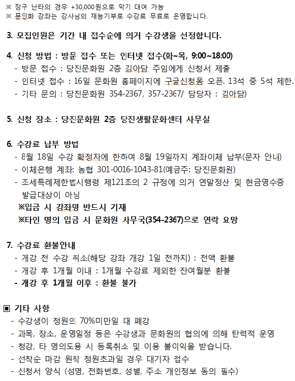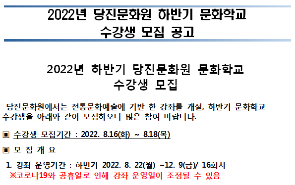 | 제목 | 하반기 당진문화원 문화학교 수강생 모집 공고 | ||||