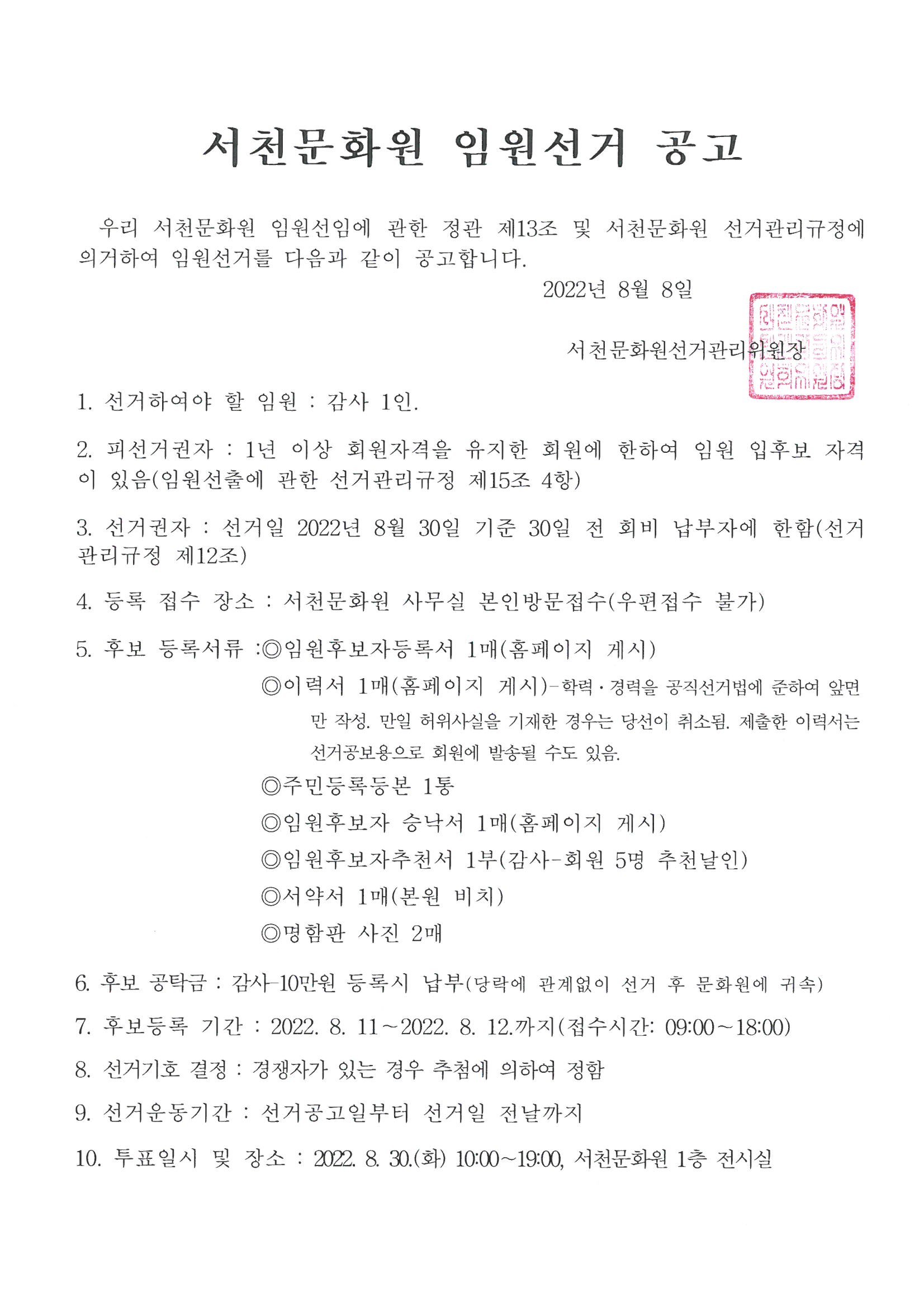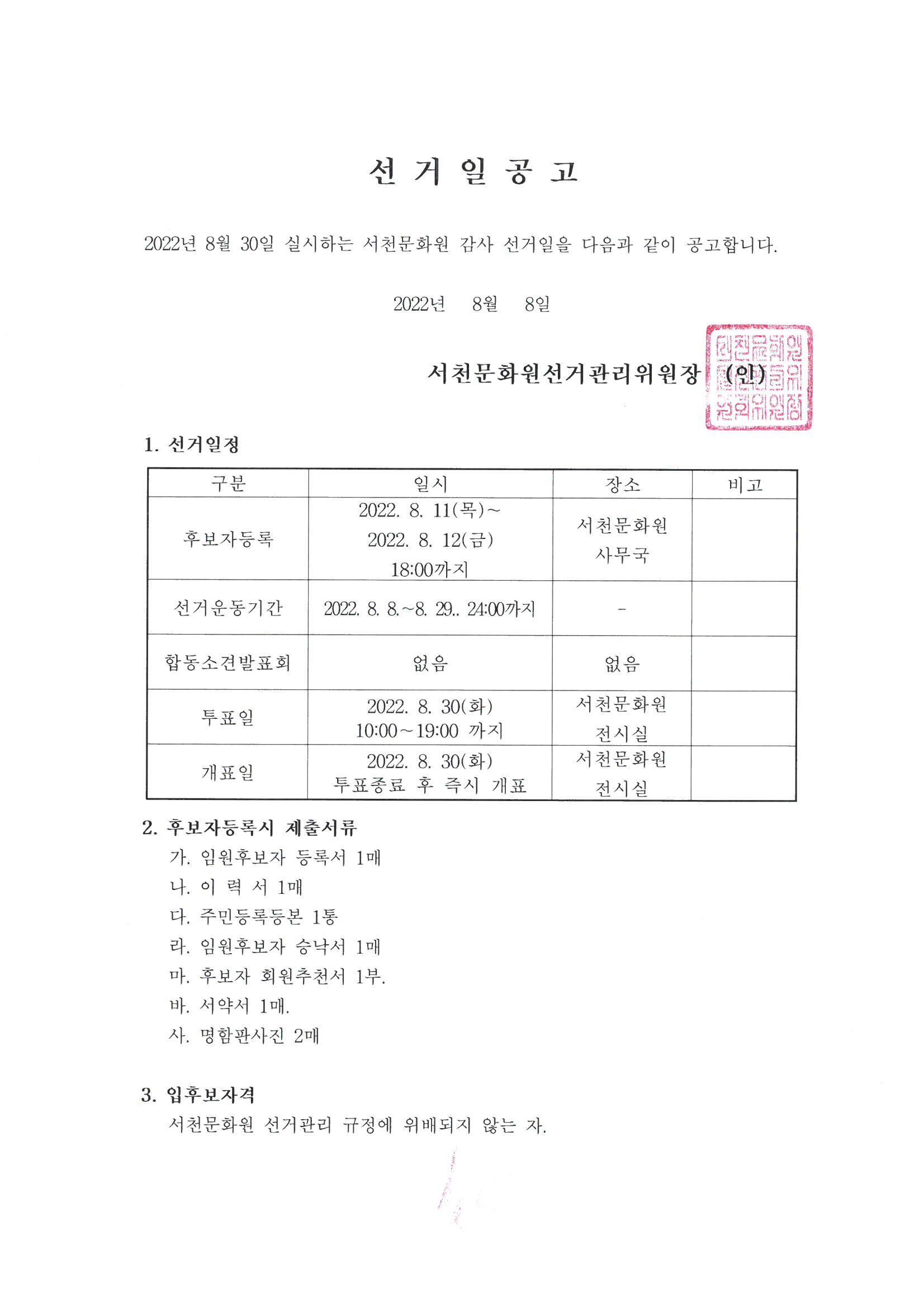 | 제목 | 서천문화원 임원선거 공고(정정-선거권자 및 추천날인사항 일부정정) | ||||