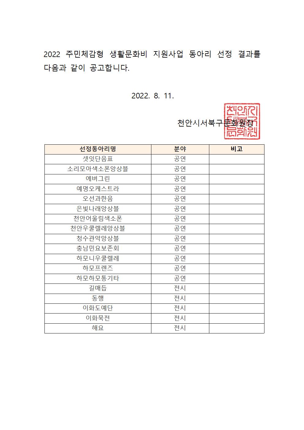 『 2022주민체감형 생활문화비지원사업 동아리선정결과 안내 』글의 상세내용을 확인하는 표로 제목, 작성자, 등록일, 조회, 첨부, 내용으로 나뉘어 설명합니다.