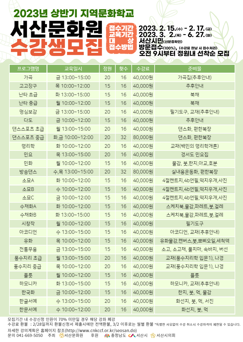 『 2023년 상반기 지역문화학교 수강생 모집 안내 』글의 상세내용을 확인하는 표로 제목, 작성자, 등록일, 조회, 첨부, 내용으로 나뉘어 설명합니다.