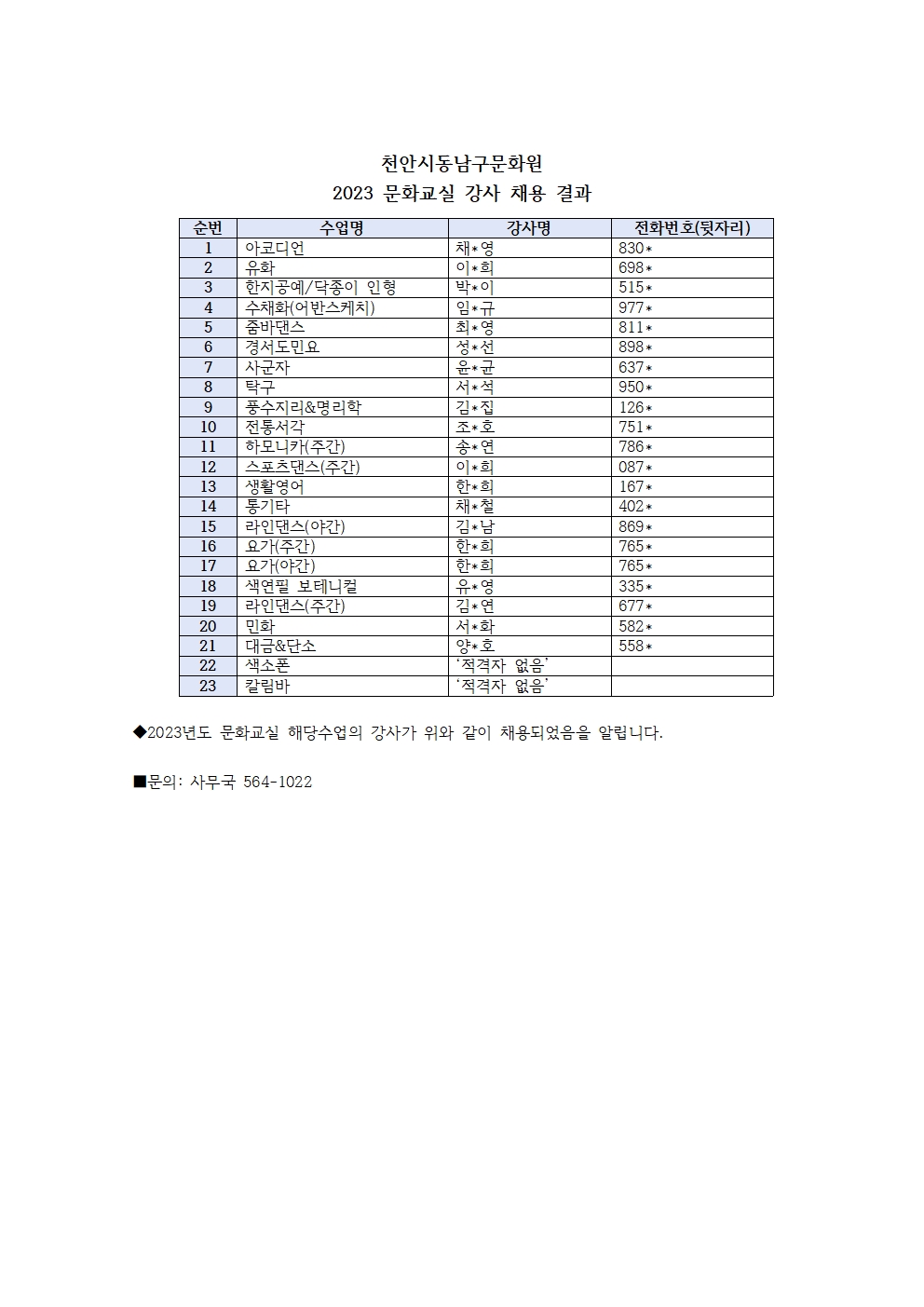2023년도 천안시동남구문화원 문화교실 강사합격자 명단은 아래와 같습니다.