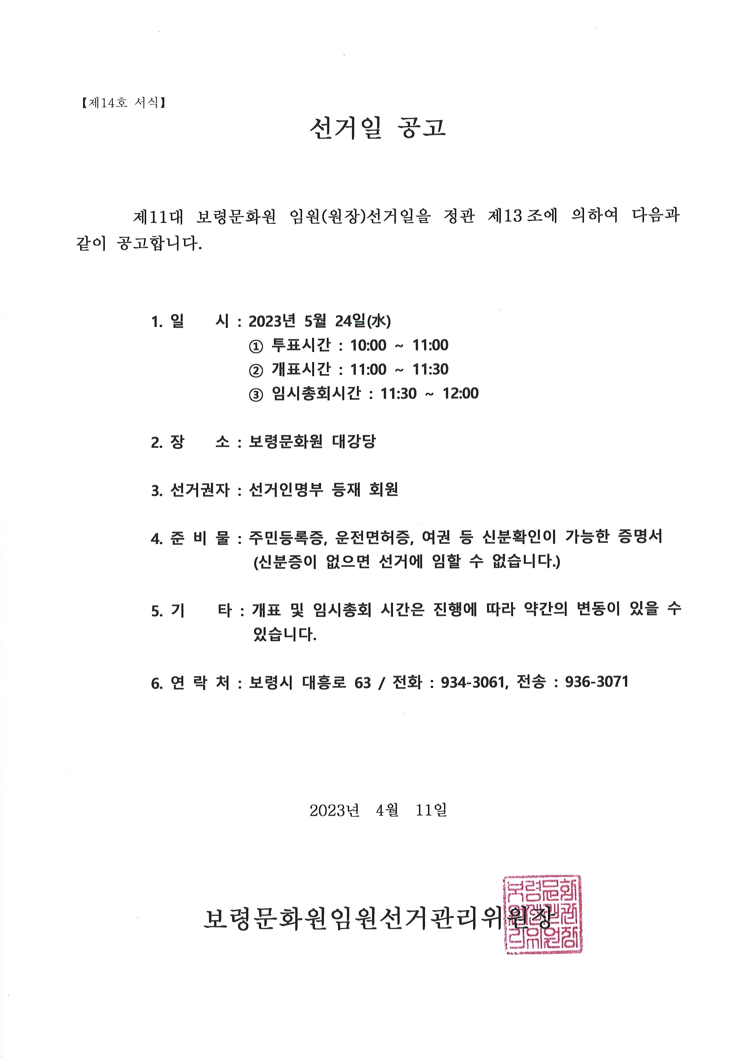 『 <선거> 보령문화원 11대 임원선거일 공고 』글의 상세내용을 확인하는 표로 제목, 작성자, 등록일, 조회, 첨부, 내용으로 나뉘어 설명합니다.