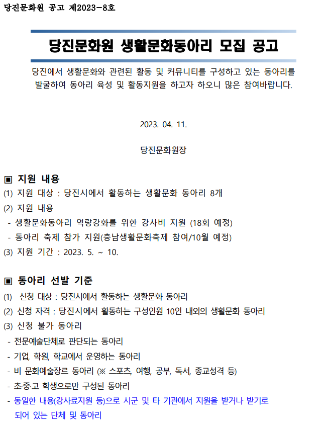 | 제목 | 2023년 생활문화활성화 지원사업 동아리 모집 | ||||