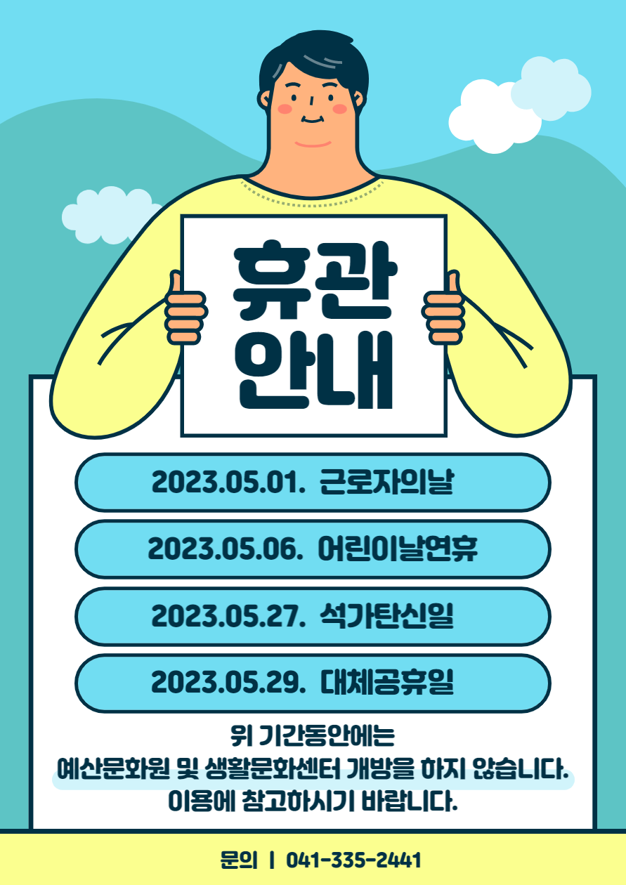 『 5월 예산문화원 및 생활문화센터 휴관안내 』글의 상세내용을 확인하는 표로 제목, 작성자, 등록일, 조회, 첨부, 내용으로 나뉘어 설명합니다.