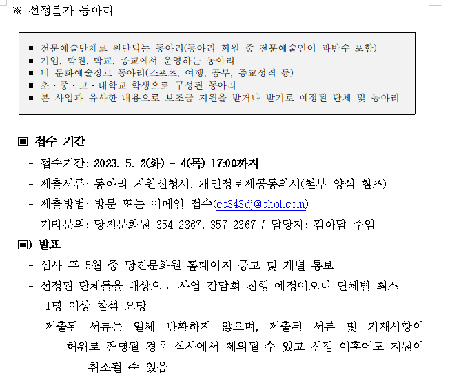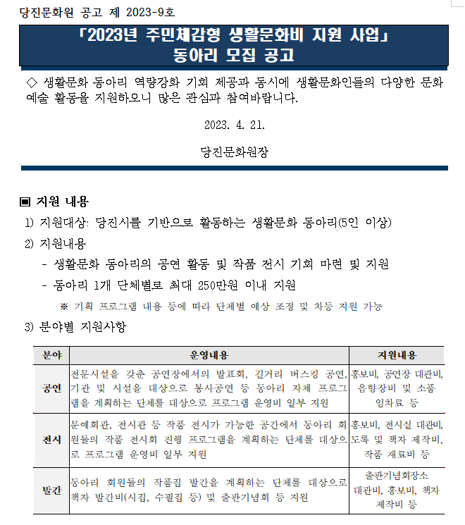 | 제목 | 2023년 주민체감형 생활문화비 지원 사업 동아리 모집 공고 | ||||