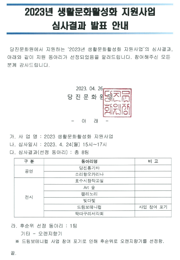 | 제목 | 2023년 생활문화활성화 지원사업 심사결과 발표 안내 | ||||