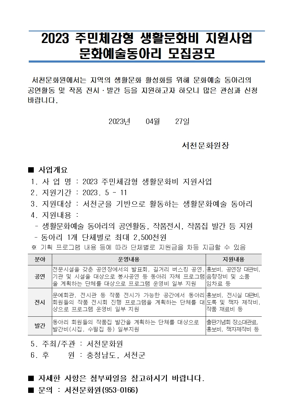 | 제목 | 2023 주민체감형 생활문화비 지원사업 문화예술동아리 모집 | ||||