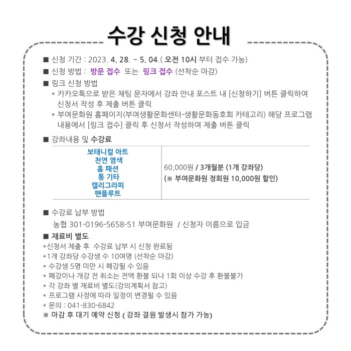 부여생활문화센터에서 2023년 생활문화강좌 수강생을 모집합니다. 자세한 내용은 아래 링크를 클릭해주시기 바랍니다. 자세히 보기 : [ 프로그램 > 부여생활문화센터 > ] (cnkccf.or.kr)