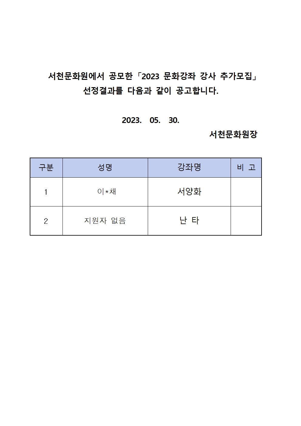 『 2023 문화강좌 강사 추가모집 선정결과 안내 』글의 상세내용을 확인하는 표로 제목, 작성자, 등록일, 조회, 첨부, 내용으로 나뉘어 설명합니다.