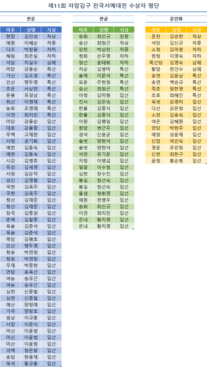 | 제목 | [심사결과] 제11회 자암김구전국서예대전 수상자 명단 | ||||
