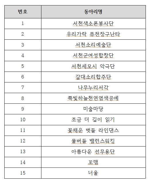 서천문화원에서 공모한 2023년 생활문화 활성화 및 체육기반 지원사업 선정결과를 아래와 같이 공고합니다. 2023. 06.16 서천문화원장