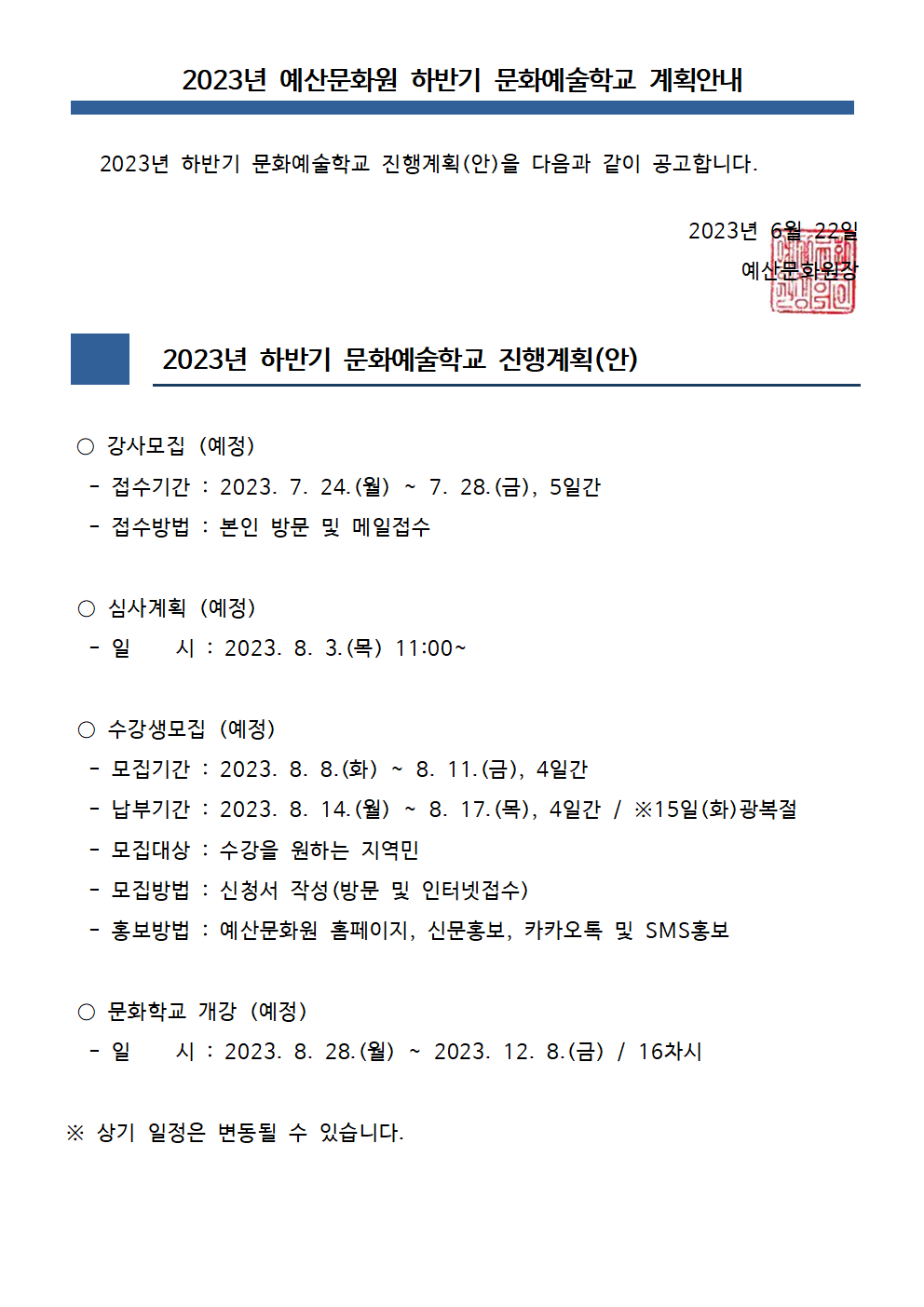 『 하반기 문화예술학교 일정안내 』글의 상세내용을 확인하는 표로 제목, 작성자, 등록일, 조회, 첨부, 내용으로 나뉘어 설명합니다.