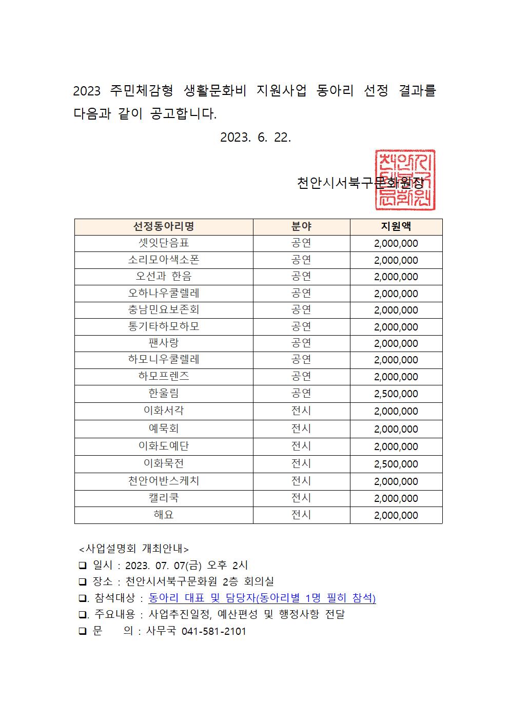 『 2023주민체감형 생활문화비지원사업 동아리선정결과 』글의 상세내용을 확인하는 표로 제목, 작성자, 등록일, 조회, 첨부, 내용으로 나뉘어 설명합니다.