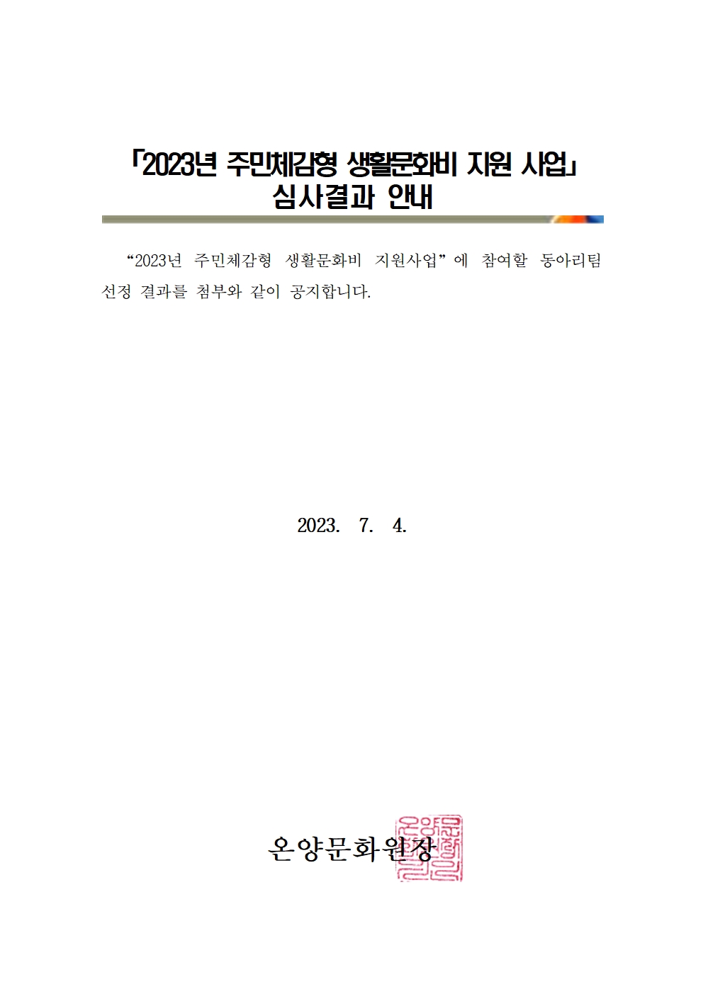 | 제목 | 2023년 주민체감형 생활문화비 지원사업 동아리 선정 결과 안내 | ||||