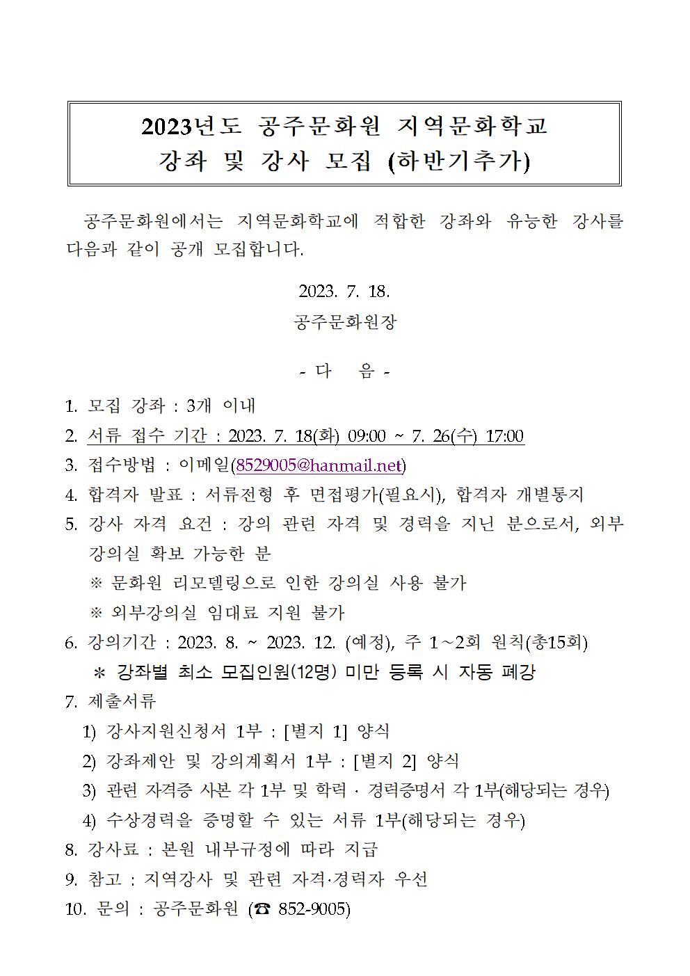2023년도 공주문화원 지역문화학교 강사 모집 공고안(추가).hwp