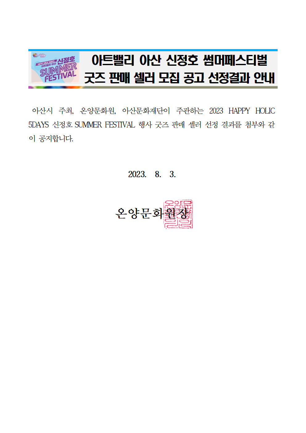 | 제목 | 굿즈 판매 셀러 모집공고 선정결과 안내 (2023 HAPPY HOLIC 5DAYS 아트밸리 아산 신정호 SUMMER FESTIVAL) | ||||