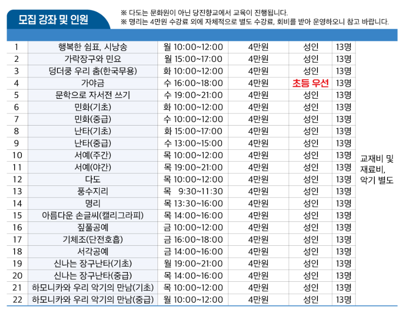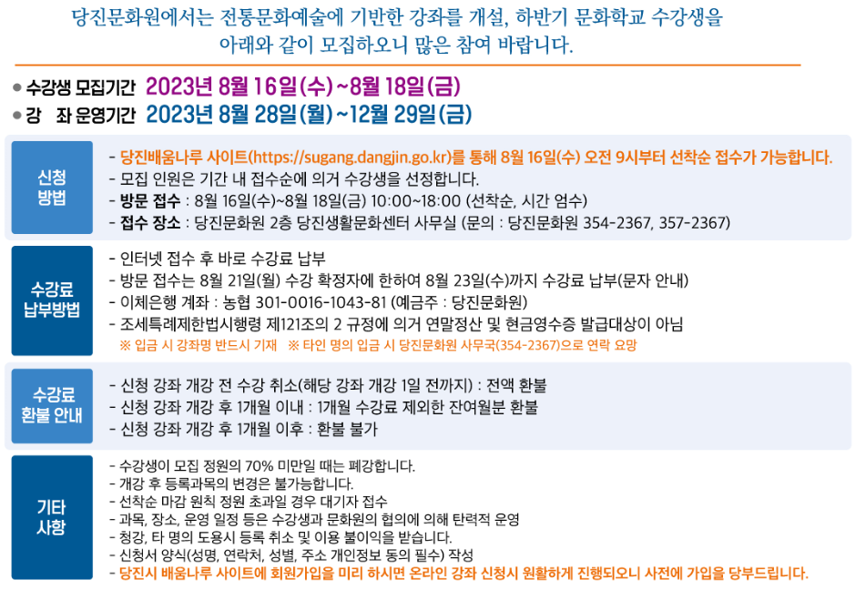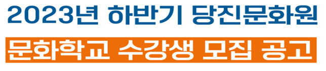 『 2023년 하반기 당진문화원 문화학교 수강생 모집 공고 』글의 상세내용을 확인하는 표로 제목, 작성자, 등록일, 조회, 첨부, 내용으로 나뉘어 설명합니다.
