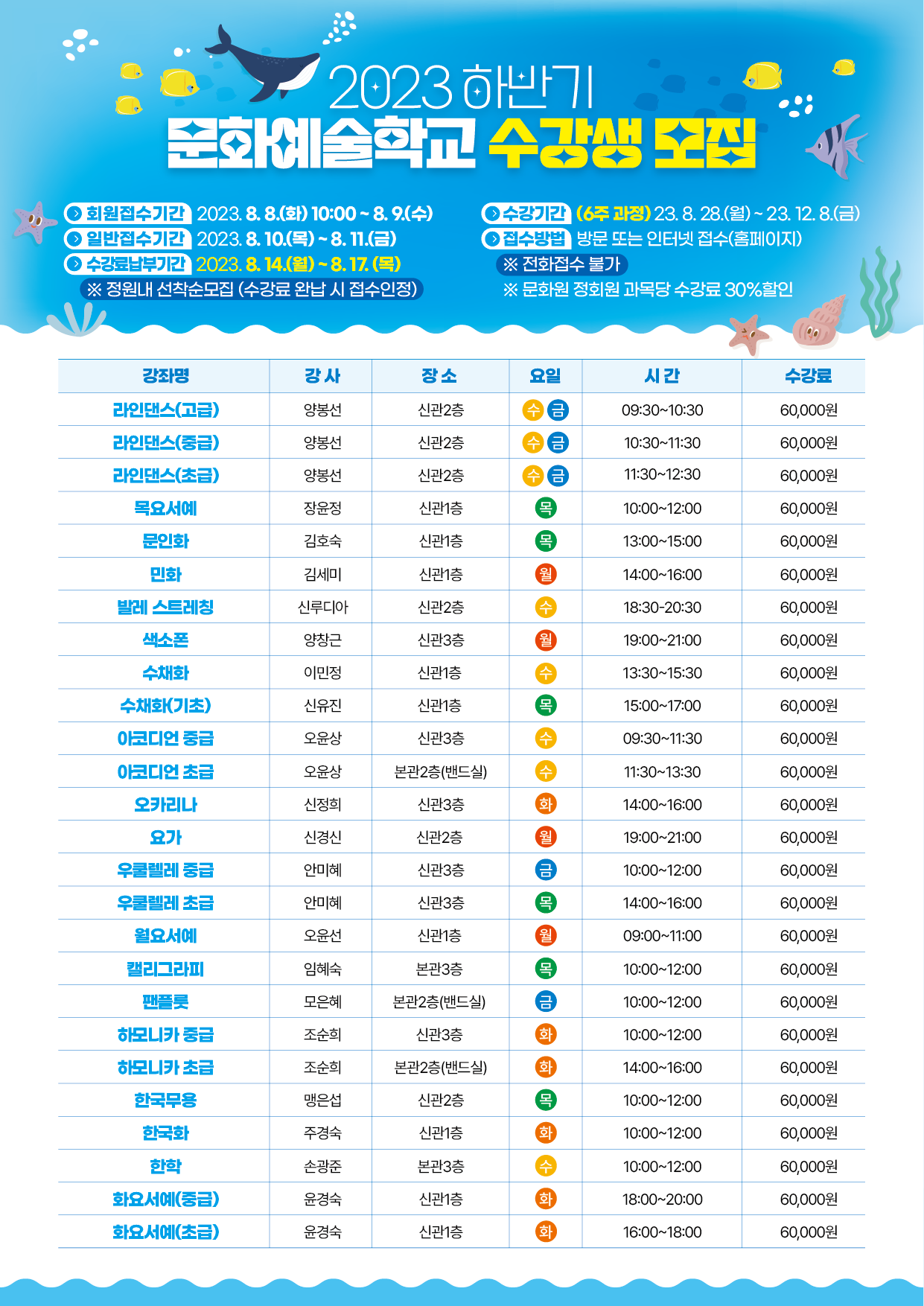 | 제목 | [23년도 하반기 문화예술학교 수강생모집] | ||||