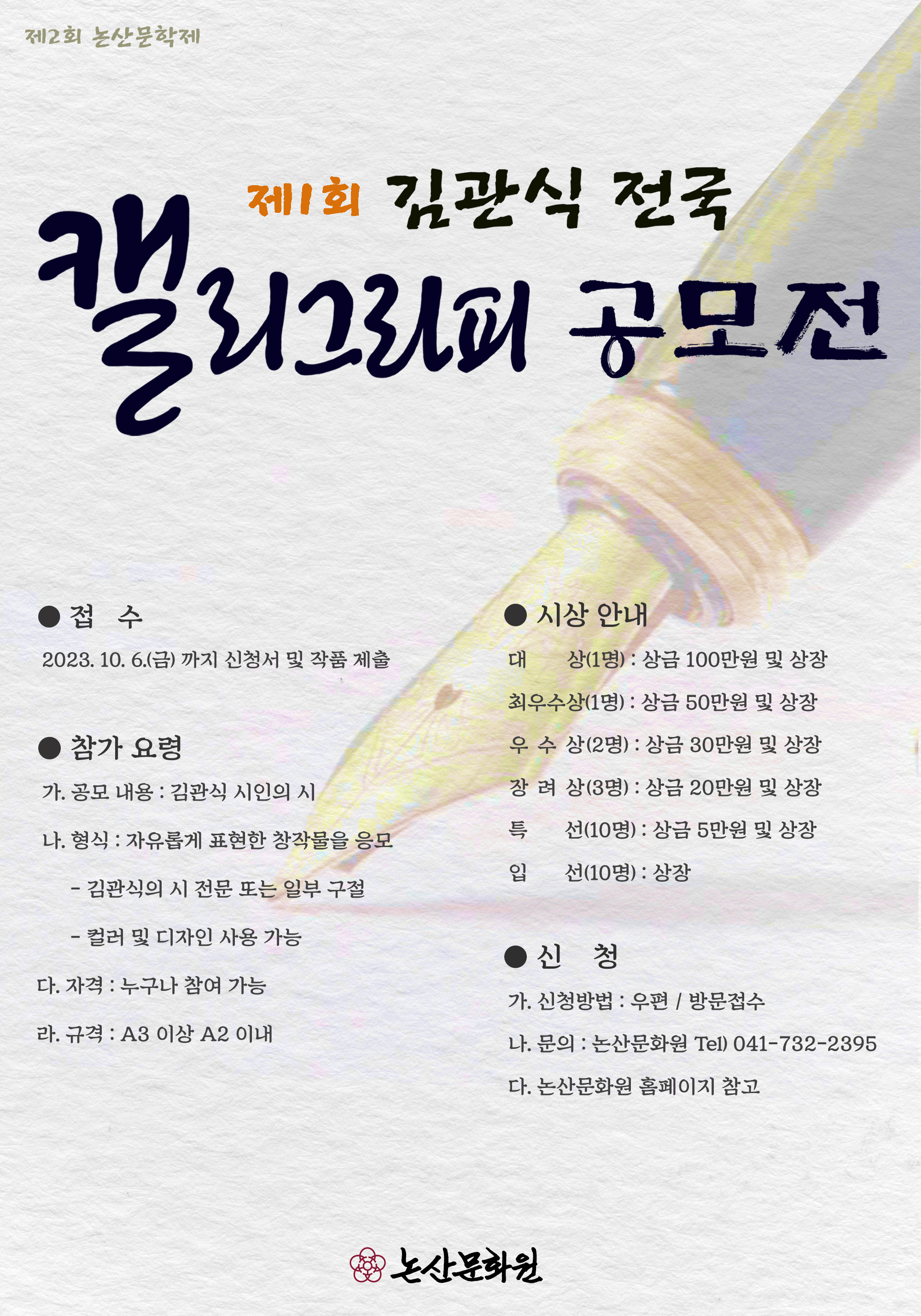 | 제목 | 제1회 김관식 전국 캘리그라피 공모전 | ||||