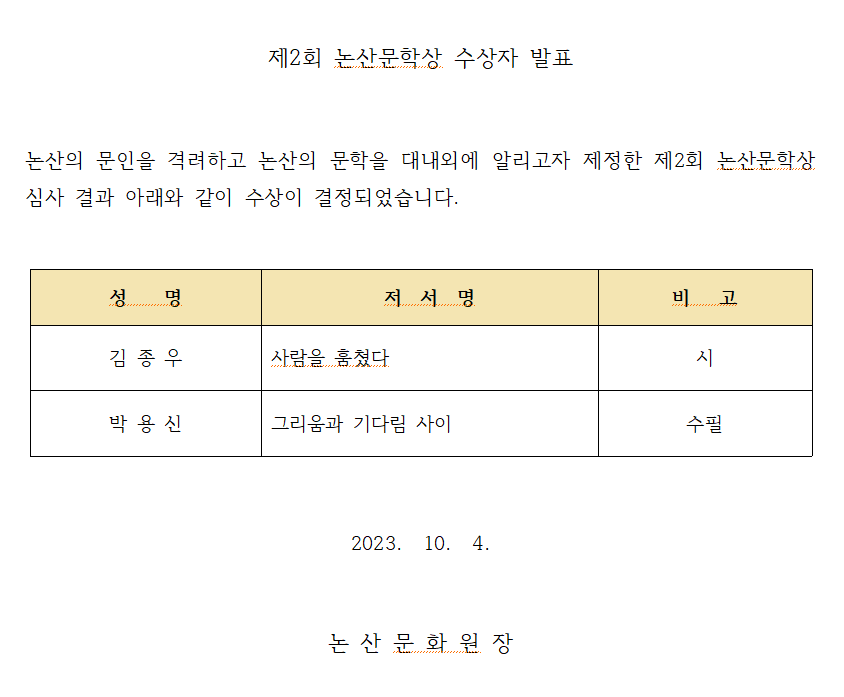 제2회 논산문학상 수상자 발표 글의 상세내용