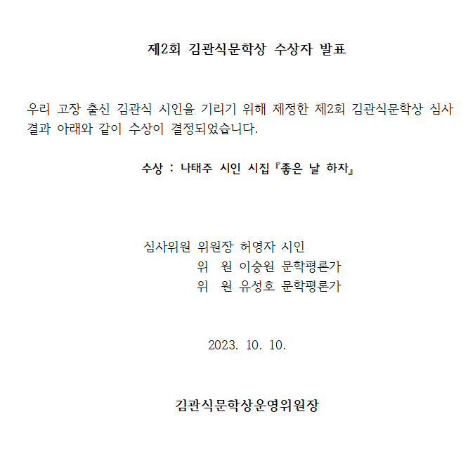 | 제목 | 제2회 김관식문학상 수상자 발표 | ||||