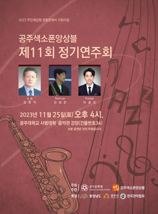 『 [2023주민체감형생활문화비지원사업] 공주색소폰앙상블 정기연주회 』글의 상세내용을 확인하는 표로 제목, 작성자, 등록일, 조회, 첨부, 내용으로 나뉘어 설명합니다.