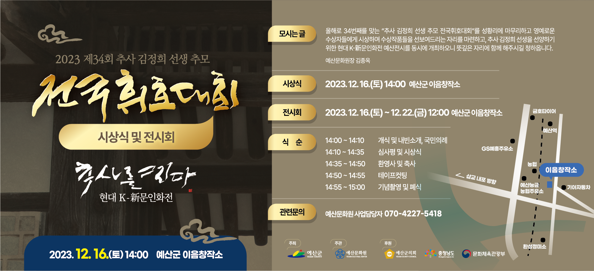 올해로 34번째를 맞는 "추사 김정희 선생 추모 전국휘호대회"를 성황리에 마무리하고 영예로운 수상자들에게 시상하며 수상작품들을 선보여드리는 자리를 마련하고, 추사 김정희 선생을 선양하기 위한 현대 K-新문인화전 예산전시를 동시에 개최하오니 뜻깊은 자리에 함께 해주시길 청하옵니다.