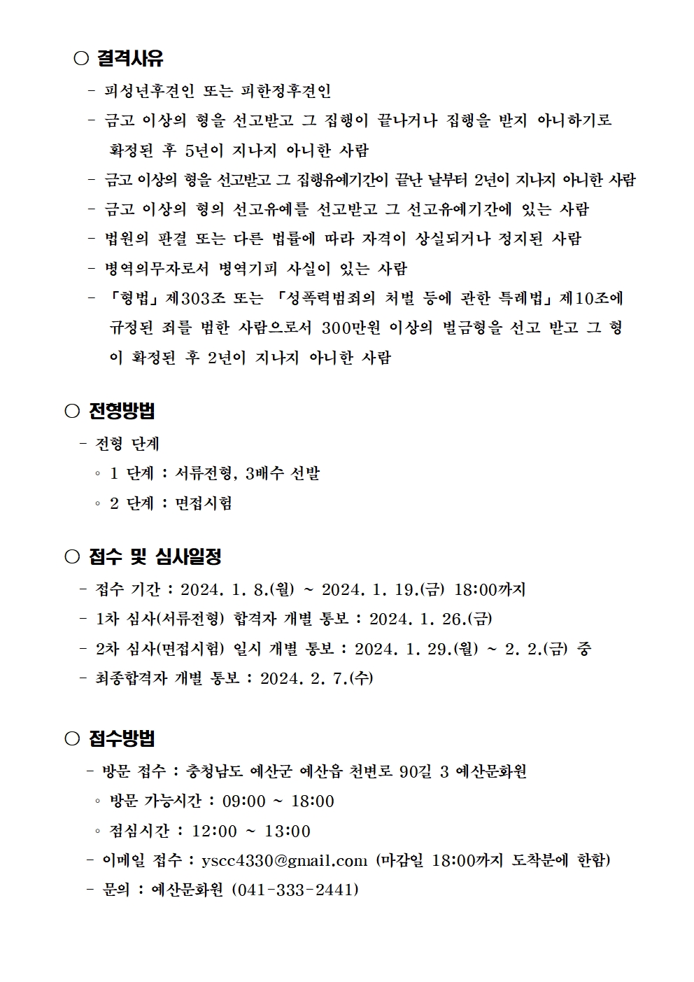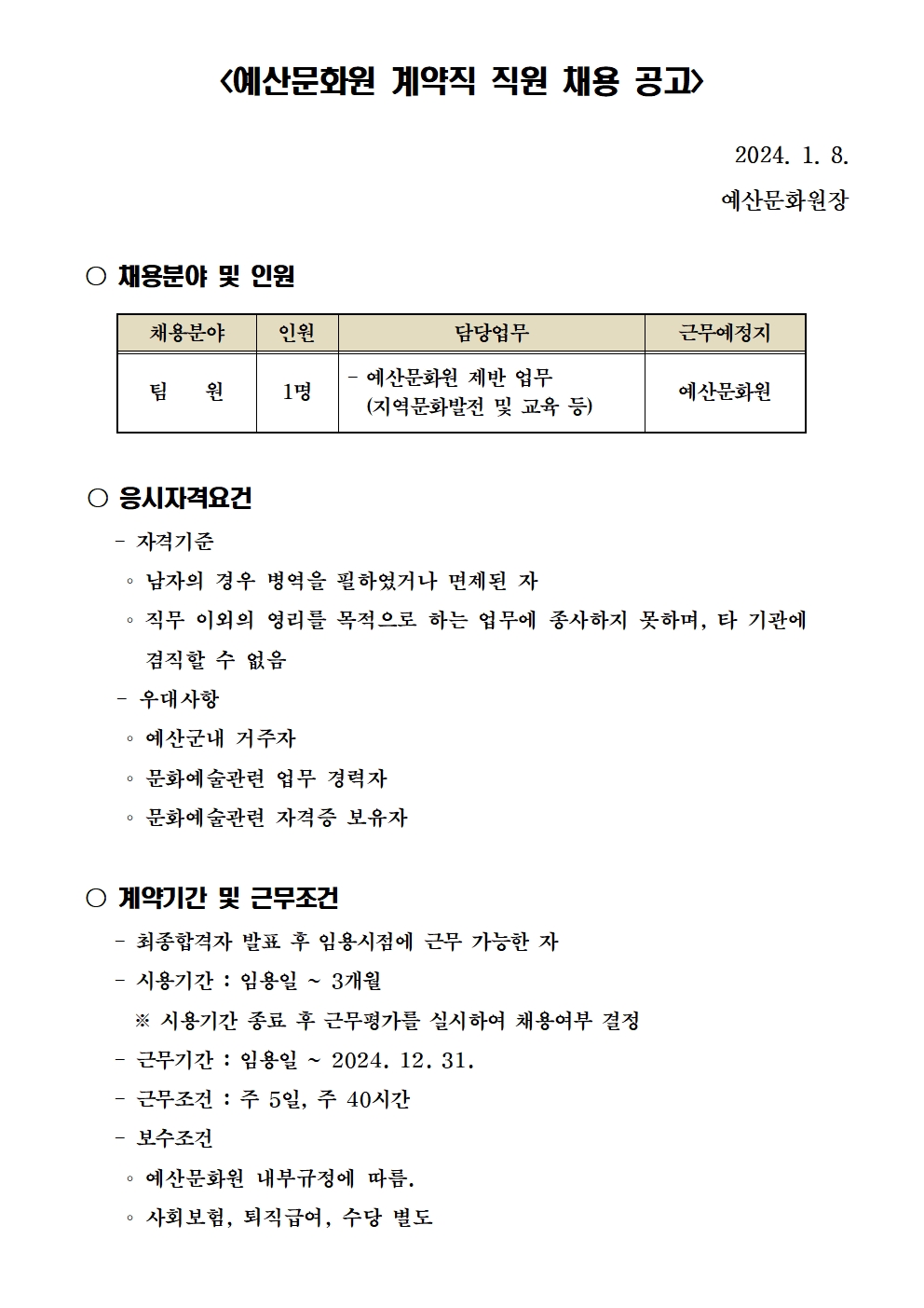 | 제목 | [직원 채용] 2024 예산문화원 계약직 직원 채용 공고 | ||||