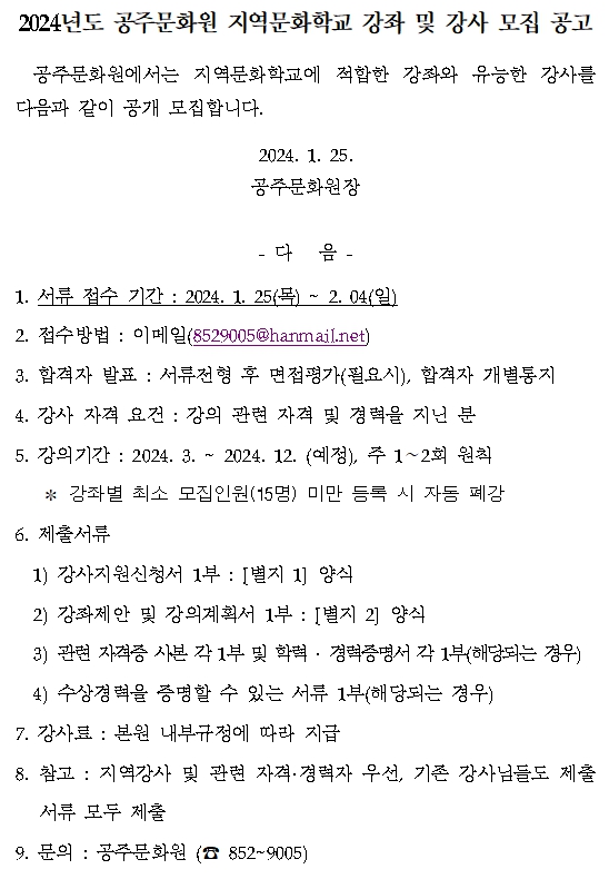 | 제목 | 2024년 지역문화학교 강좌 및 강사 모집 공고 | ||||