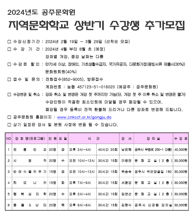 | 제목 | 2024 지역문화학교 상반기 수강생 추가모집 | ||||
