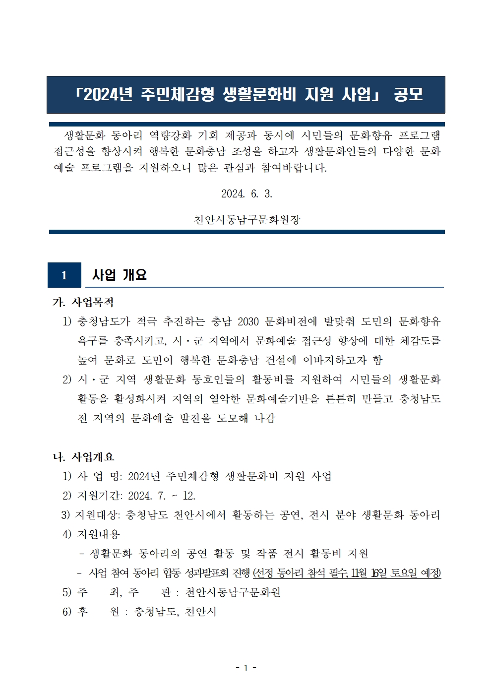 | 제목 | 2024 주민체감형 생활문화비 지원 사업 동아리 모집 공고문. | ||||