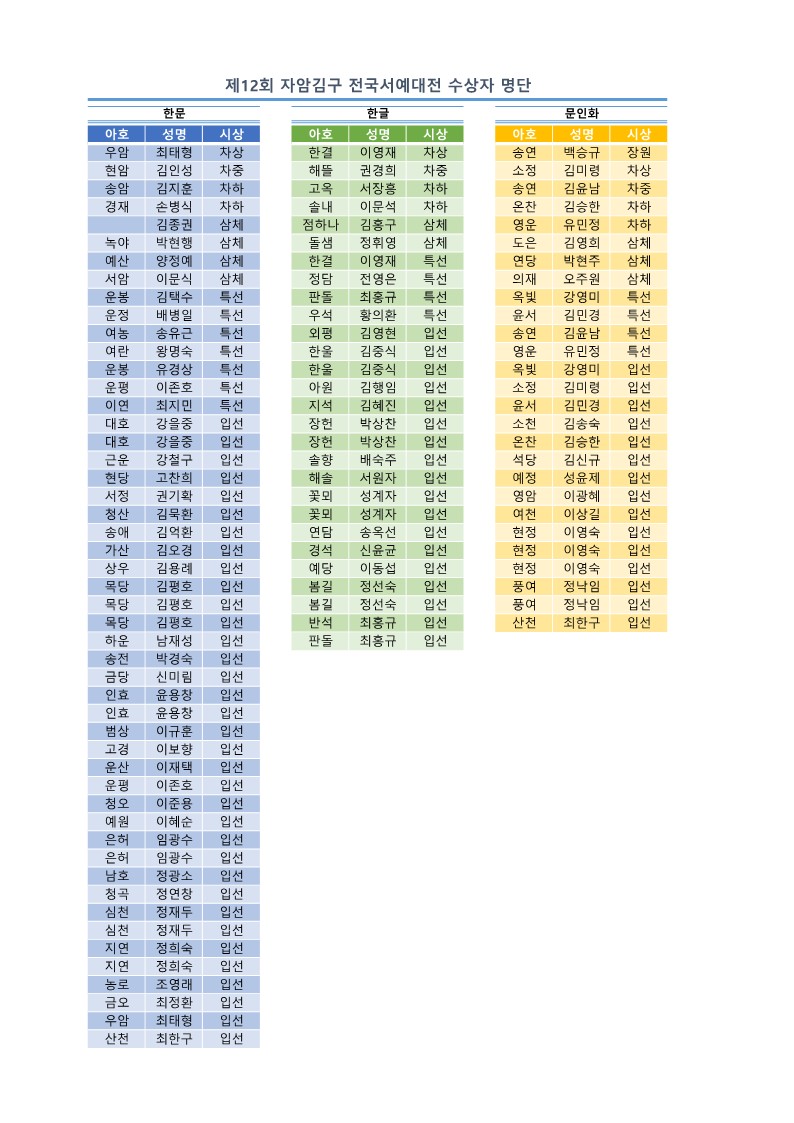 [심사결과] 제12회 자암김구 전국서예대전 심사결과안내 제12회 자암김구 전국서예대전 심사결과를 다음과 같이 공고합니다. <심사개요> - 일 시 : 6. 8.(토) 10:00 ~ 13:00 - 장 소 : 예산문화원 및 생활문화센터 - 심사위원 : 9인 (한글 3, 한문 3, 문인화 3) ◽ 한 글 부문 : 정명화(분과위원장), 김문영, 송경녀 ◽ 한 문 부문 : 김현선(심사위원장 및 분과위원장), 이명옥, 최규숙 ◽ 문인화 부문 : 정석흔(분과위원장), 박정범, 조운호 <수상자 검증 심사> - 대상자 : 장원, 차상, 차중, 차하 - 휘호 동영상 제출 ◽ 제출기한 : ~ 6. 13.(목) ◽ 제출방법 : 이메일 제출 (yscc4330@gmail.com) ※ 기한 내 미제출 시 수상을 포기하는 것으로 간주함. <표구 및 도록 신청> - 신청기한 : ~ 6. 19.(수) - 신청금액 : 1점당 50,000원 - 계좌번호 : 농협은행 301-0222-0392-51 - 예 금 주 : 예산문화원 ※ 기한 내 미신청 시 수상을 포기하는 것으로 간주함. ※ 입선자는 예산문화원에서 일괄 표구 전시하며 미신청자는 낙선 처리함. ※ 출품된 작품은 반환하지 아니하며, 특선과 입선 작품은 전시회 종료 후 개별 택배 반환예정 ※ 시상식 및 전시회는 8월 3일(토) 예정으로 추후 문자 안내드릴 예정