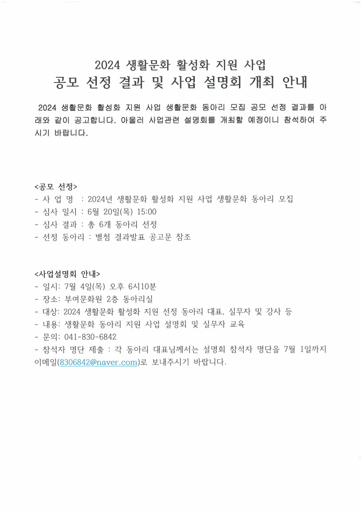 | 제목 | 2024 생활문화활성화 지원사업 생활문화동아리 모집 선정 결과발표 | ||||