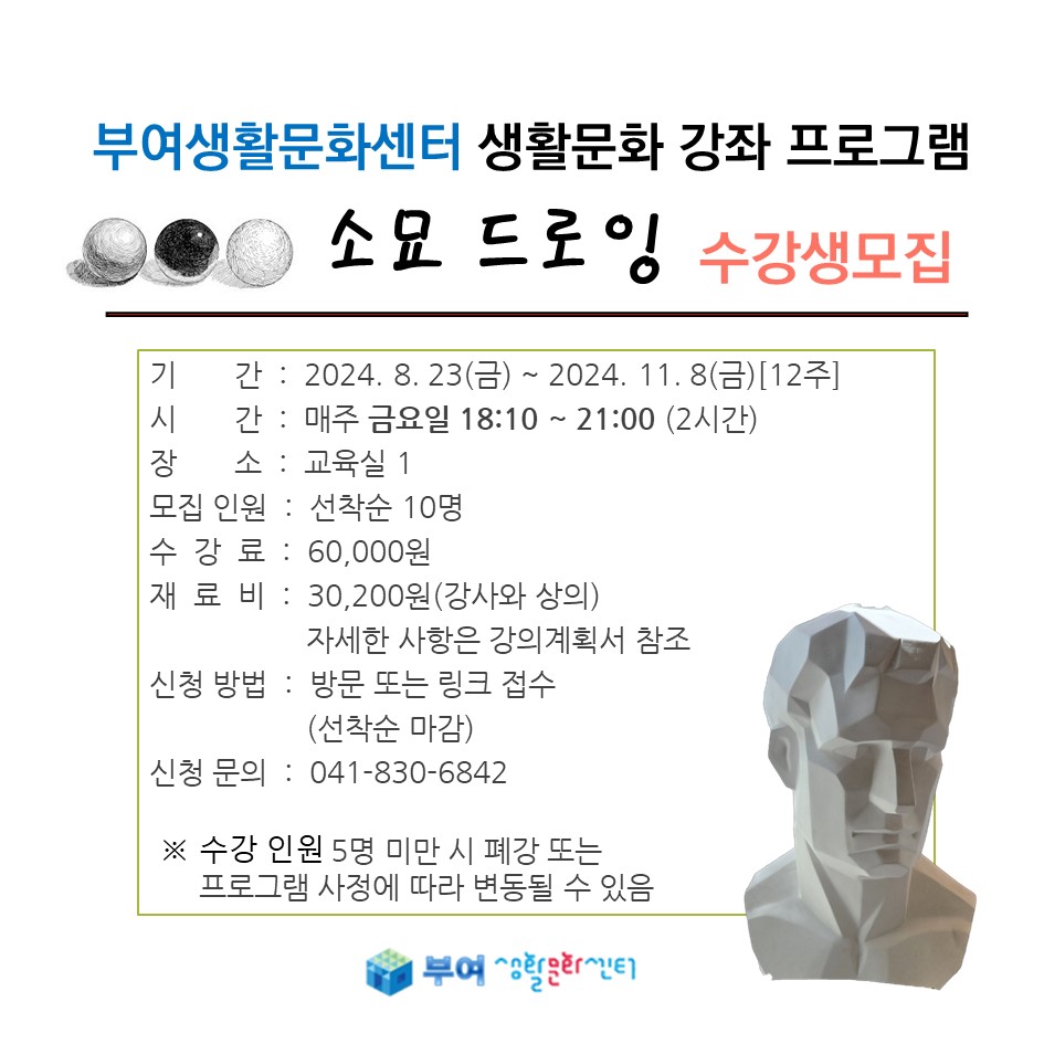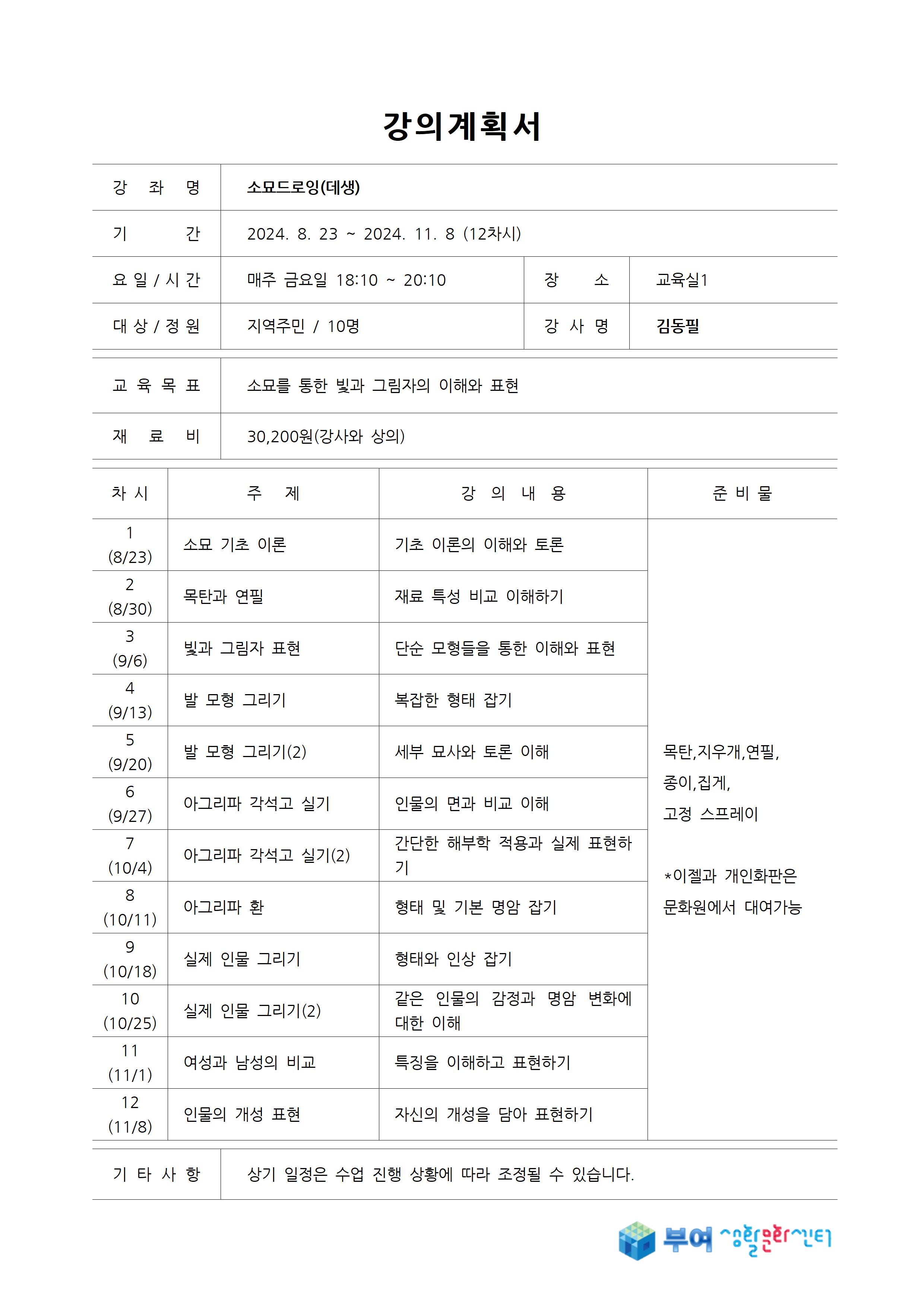 『 [소묘드로잉] 2024 하반기 생활문화강좌 수강생 모집안내 』글의 상세내용을 확인하는 표로 제목, 작성자, 등록일, 조회, 첨부, 내용으로 나뉘어 설명합니다.