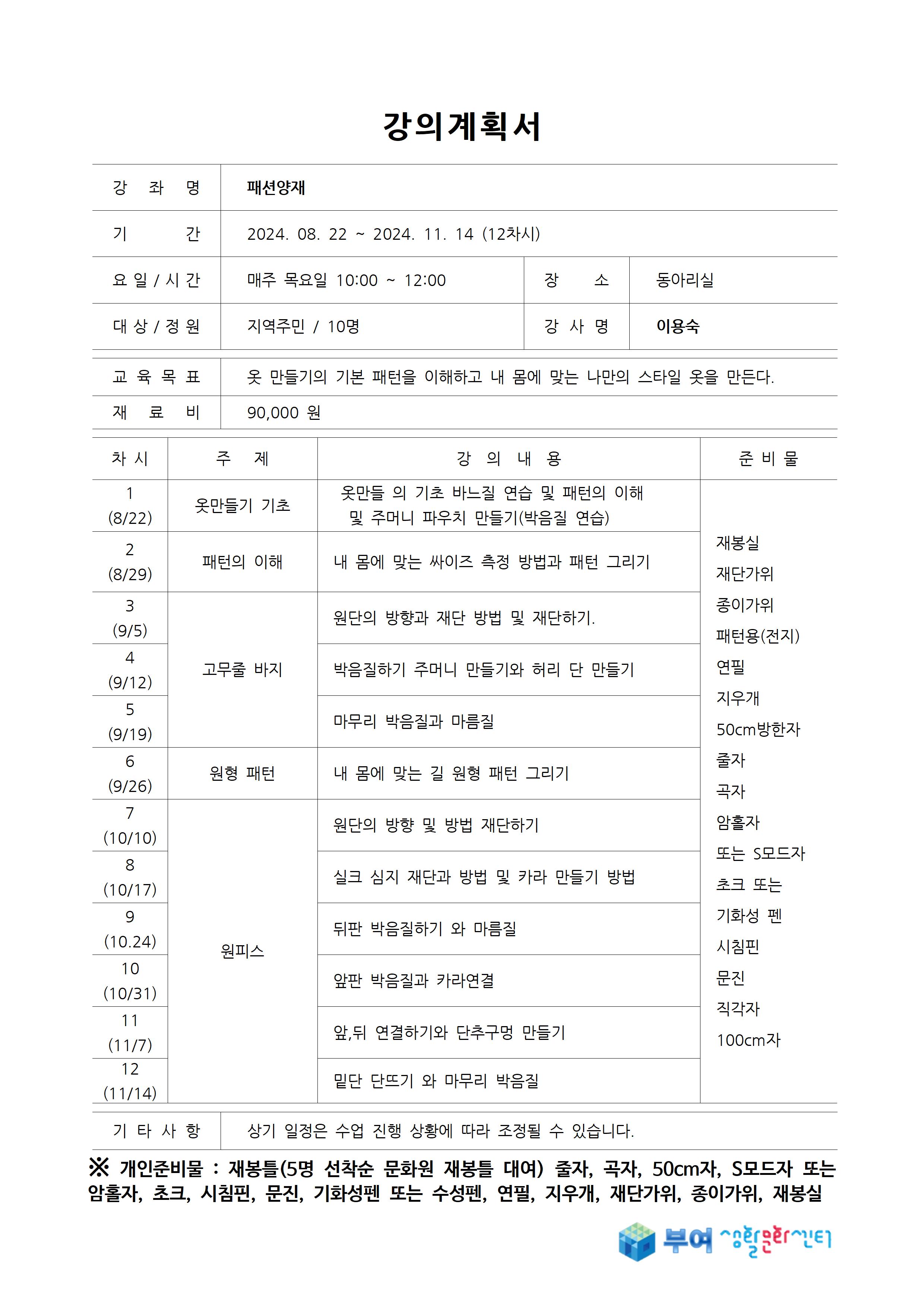 『 [패션양재] 2024 하반기 생활문화강좌 수강생 모집안내 』글의 상세내용을 확인하는 표로 제목, 작성자, 등록일, 조회, 첨부, 내용으로 나뉘어 설명합니다.