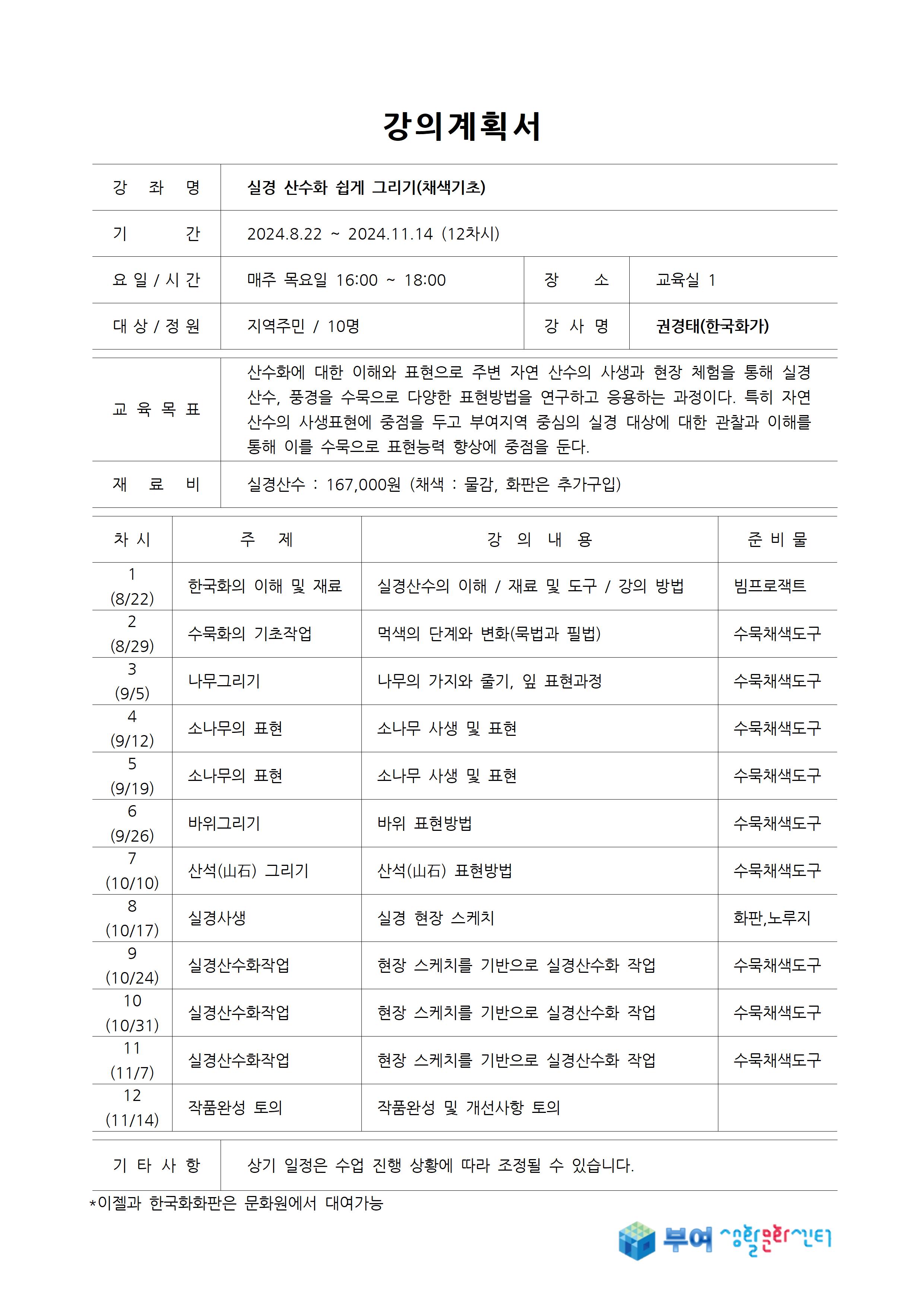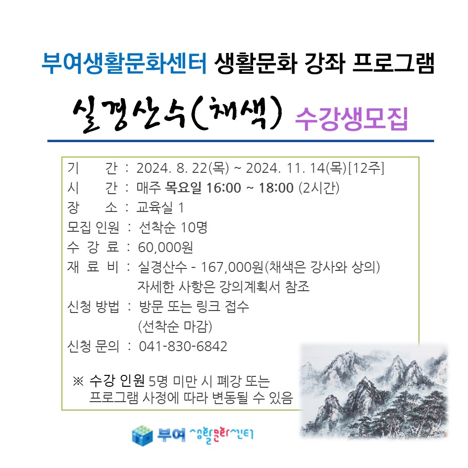 『 [실경산수] 2024 하반기 생활문화강좌 수강생 모집안내 』글의 상세내용을 확인하는 표로 제목, 작성자, 등록일, 조회, 첨부, 내용으로 나뉘어 설명합니다.