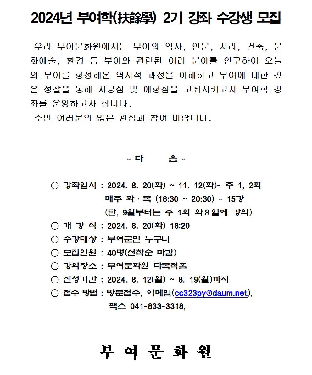| 제목 | [공지[ 2024년 부여학〔扶餘學〕 강좌 2기 수강생 모집 안내 | ||||