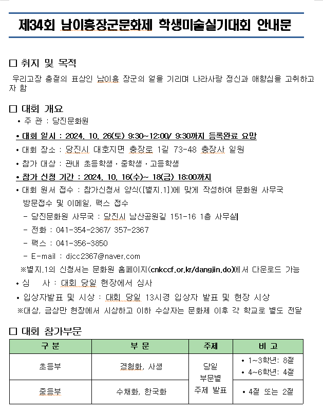 | 제목 | 제34회 남이흥장군문화제 학생미술실기대회 안내 | ||||